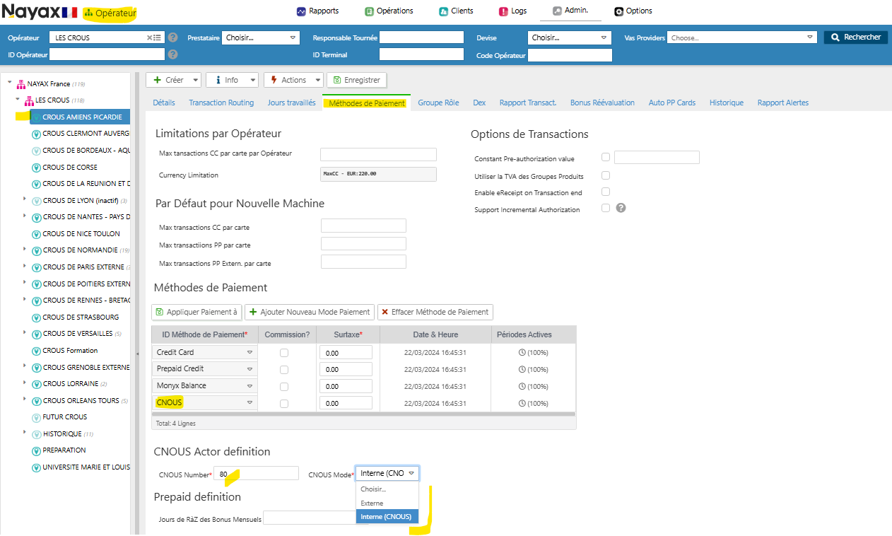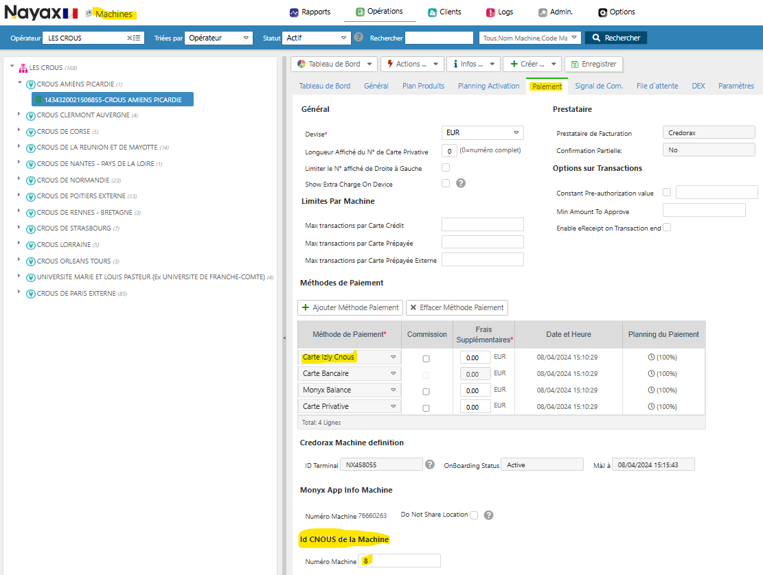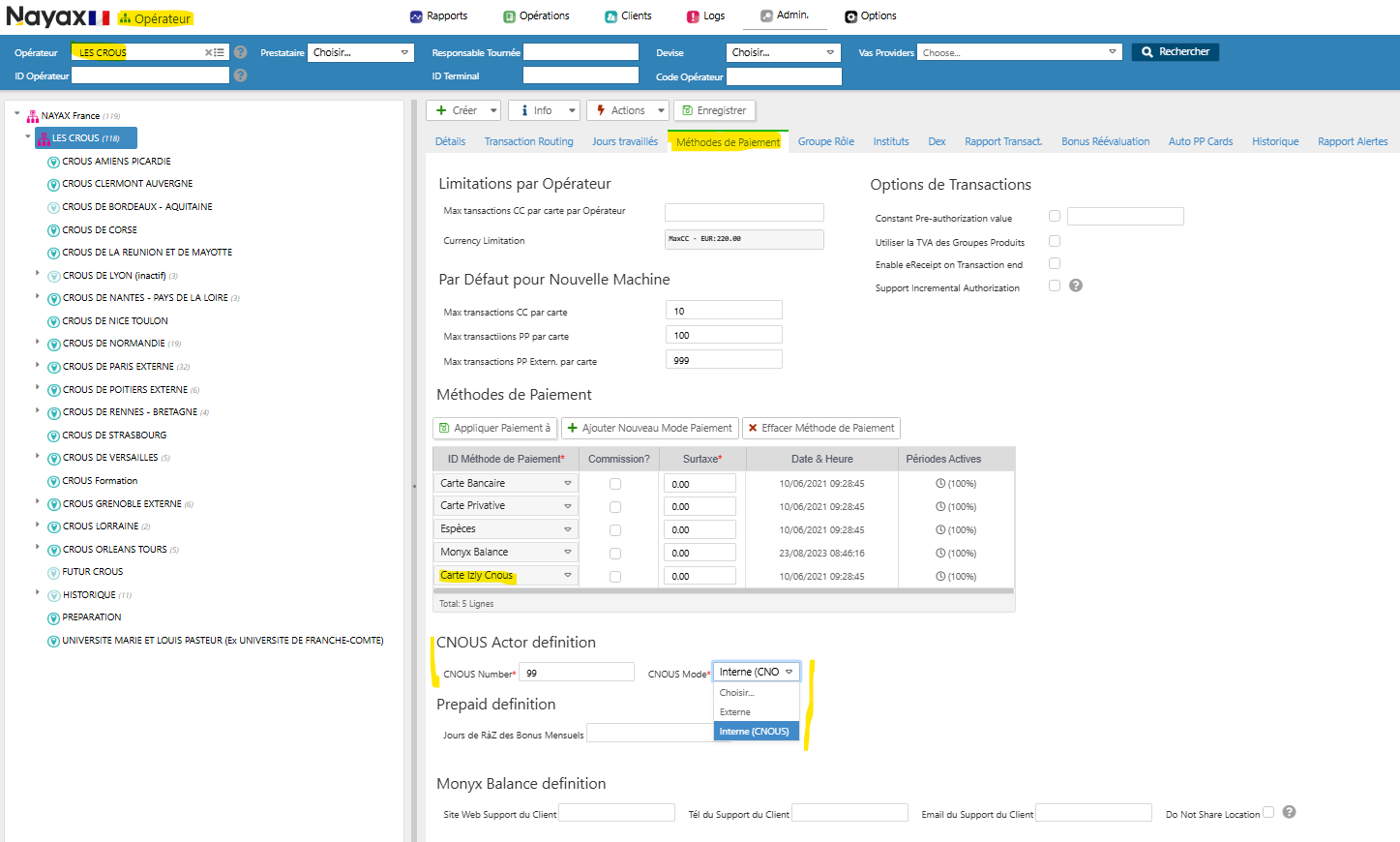 2) ajouter le mode de paiement CNOUS côté Nayax Core ainsi que les codes PDV (CNOUS Number)