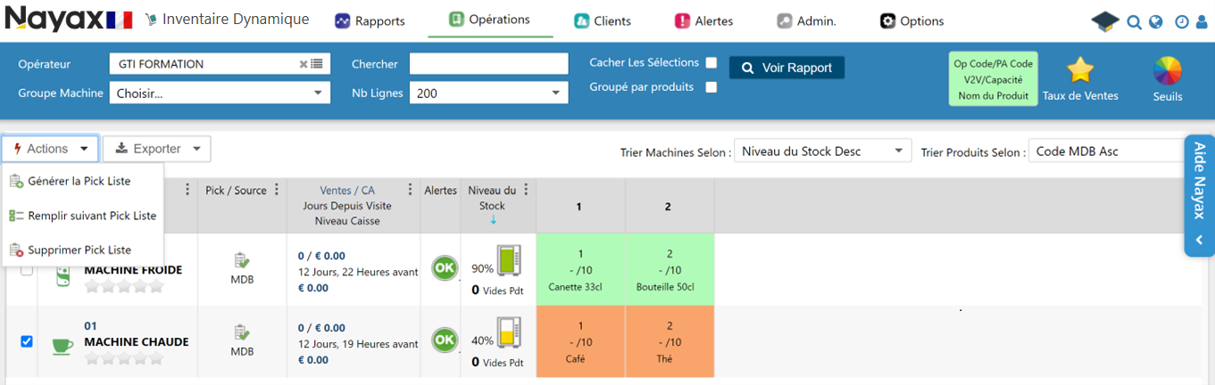 Une Pick liste est une liste créée automatiquement par les fonctionnalités du portail Nayax pour pointer l’ensemble des produits à recharger dans une Machine à un instant t. Cette Pick liste est aussi réalisatble depuis l'appli MoMa.